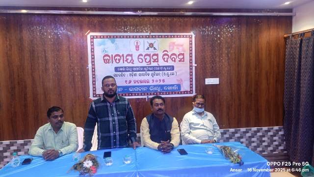 ପ୍ରସନ୍ନ କୁମାର ପାଇକରାୟଙ୍କ ରିପୋର୍ଟଖୋର୍ଦ୍ଧା, ୧୭/୧୧: ଓଡିଶା ସାମ୍ବାଦିକ ୟୁନିୟନ(ଓୟୁଜେ) ଖୋର୍ଦ୍ଧା ଜିଲ୍ଲା ଶାଖା ପକ୍ଷରୁ ଜାତୀୟ ପ୍ରେସ ଦିବସ ସ୍ଥାନୀୟ ଭଗବାନ ଭିଲ୍ଲା ଠାରେ ଅନୁଷ୍ଠିତ ହୋଇଯାଇଛି। ଜିଲ୍ଲା ସାଧାରଣ ସମ୍ପାଦକଲୋହିତ ନାରାୟଣ ମହାପାତ୍ରଙ୍କ ଅଧ୍ୟକ୍ଷତାରେ ଆୟୋଜିତ ସଭାରେ ମୁଖ୍ୟ