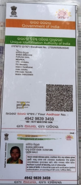 ସଞ୍ଜୟ କୁମାର ପାଣିଗ୍ରାହୀଙ୍କ ରିପୋର୍ଟବାଲିଗୁଡା,୧୭/୧୨ : ଆଧାରକାର୍ଡରେ ନାମ ତ୍ରୁଟି ଯୋଗୁଁ ଅସହାୟ ବିଧବା ମହିଳା ଭତା ପାଇବାରୁ ବଂଚିତ । ବାଲିଗୁଡା ବ୍ଲକ ଅନ୍ତର୍ଗତ ମିଡିଆକିଆ ପଂଚାୟତର ପୁରୁଣା ସାହିର ଫିମ୍ପା ବିନ୍ଧାଣୀ(୪୧)ଙ୍କ ଭୋଟପରିଚୟପତ୍ର.ରେସନକାର୍ଡ,ବ୍ୟାଙ୍କ ଖାତା ରେ ଫିମ୍ପା ବିନ୍ଧାଣି