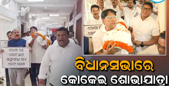 ଭୁବନେଶ୍ୱର,୧୮/୩: ବିଧାନସଭାରେ ବୁଧବାର ଏକ ଅଭାବନୀୟ ଘଟଣା ଦେଖାଯାଇଛି। SCB ଟ୍ରାଜେଡିକୁ ଦେଇ ଗୃହରେ କମ୍ପିଛନ୍ତି ବିରୋଧୀ। ବିଧାନସଭାରେ ପ୍ରତିକାତ୍ମକ କୋକେଇ ଶୋଭାଯାତ୍ରା ବାହାର କରିଛନ୍ତି ବିରୋଧୀ ବିଜେଡି।‘ରାମ ନାମ ସତ୍ୟ ହେ’ ଧ୍ୱନିରେ ପ୍ରକମ୍ପିତ ହେଲା ବିଧାନସଭା ପରିସର। SCB