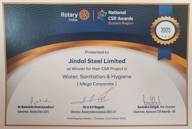 Bhubaneswar, Oct. 25: Recognising its exemplary contribution to improving rural water access and sanitation, Jindal Steel has been conferred with the Rotary India National CSR Award 2025 (Eastern Region) in the Water, Sanitation, and Hygiene (WASH) Mega Category. In a grand programme held in Kolkata on October 23, 2025, Jindal Steel’s President and Group Head (CSR & Education), Shri Prashant Hota, received the prestigious award from Flt. Lt. Rtn. K.P. Nagesh, Director, Rotary International, in the presence of Padma Bhushan Usha Uthup, renowned actor Rituparna Sengupta, and other dignitaries.